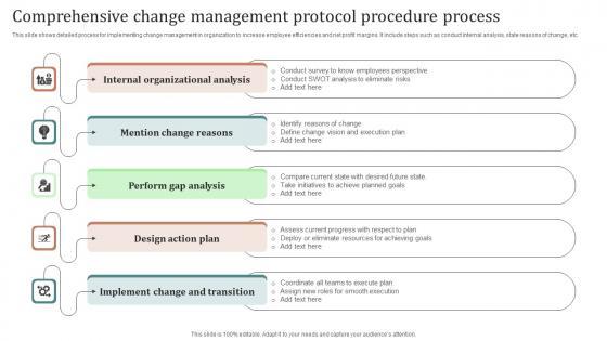 This slide shows detailed process for implementing change management in organization to increase employee efficiencies and net profit margins. It include steps such as conduct internal analysis, state reasons of change, etc. Showcasing this set of slides titledComprehensive Change Management Protocol Procedure Process Ppt Icon Samples Pdf. The topics addressed in these templates are Internal Organizational Analysis, Mention Change Reasons, Perform Gap Analysis. All the content presented in this PPT design is completely editable. Download it and make adjustments in color, background, font etc. as per your unique business setting. This slide shows detailed process for implementing change management in organization to increase employee efficiencies and net profit margins. It include steps such as conduct internal analysis, state reasons of change, etc.