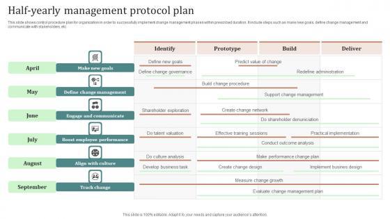 This slide shows control procedure plan for organization in order to successfully implement change management phases within prescribed duration. It include steps such as make new goals, define change management and communicate with stakeholders, etc. Showcasing this set of slides titled Half Yearly Management Protocol Plan Ppt Gallery Outline Pdf. The topics addressed in these templates are New Goals, Define Change, Management, Communicate. All the content presented in this PPT design is completely editable. Download it and make adjustments in color, background, font etc. as per your unique business setting. This slide shows control procedure plan for organization in order to successfully implement change management phases within prescribed duration. It include steps such as make new goals, define change management and communicate with stakeholders, etc.
