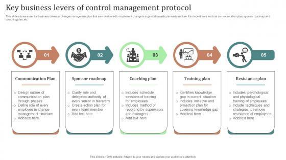 This slide shows essential business drivers of change management plan that are considered to implement change in organization with planned structure. It include drivers such as communication plan, sponsor roadmap and coaching plan, etc. Showcasing this set of slides titled Key Business Levers Of Control Management Protocol Ppt Icon Themes Pdf. The topics addressed in these templates are Communication Plan, Sponsor Roadmap, Coaching Plan. All the content presented in this PPT design is completely editable. Download it and make adjustments in color, background, font etc. as per your unique business setting. This slide shows essential business drivers of change management plan that are considered to implement change in organization with planned structure. It include drivers such as communication plan, sponsor roadmap and coaching plan, etc.