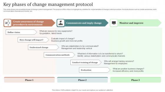 This slide shows core essential phases of change control management. The purpose of this slide is to highlight key activities for implementation of change control procedure. It include phases such as create awareness, build communication channels and monitor, etc. Pitch your topic with ease and precision using this Key Phases Of Change Management Protocol Ppt Outline Gridlines Pdf. This layout presents information on Create Awareness, Build Communication, Channels And Monitor. It is also available for immediate download and adjustment. So, changes can be made in the color, design, graphics or any other component to create a unique layout. This slide shows core essential phases of change control management. The purpose of this slide is to highlight key activities for implementation of change control procedure. It include phases such as create awareness, build communication channels and monitor, etc.