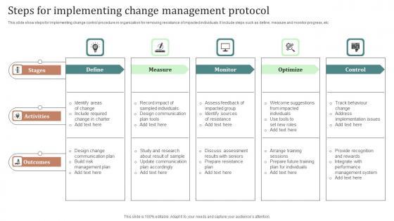 This slide show steps for implementing change control procedure in organization for removing resistance of impacted individuals. It include steps such as define, measure and monitor progress, etc. Pitch your topic with ease and precision using this Steps For Implementing Change Management Protocol Ppt Visual Aids Model Pdf. This layout presents information on Stages, Activities, Outcomes, Measure. It is also available for immediate download and adjustment. So, changes can be made in the color, design, graphics or any other component to create a unique layout. This slide show steps for implementing change control procedure in organization for removing resistance of impacted individuals. It include steps such as define, measure and monitor progress, etc.