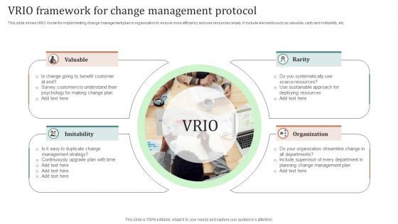 This slide shows VRIO model for implementing change management plan in organization to ensure more efficiency and use resources wisely. It include elements such as valuable, rarity and imitability, etc. Showcasing this set of slides titled VRIO Framework For Change Management Protocol Ppt Professional Images Pdf. The topics addressed in these templates are This slide shows VRIO model for implementing change management plan in organization to ensure more efficiency and use resources wisely. It include elements such as valuable, rarity and imitability, etc.. All the content presented in this PPT design is completely editable. Download it and make adjustments in color, background, font etc. as per your unique business setting. This slide shows VRIO model for implementing change management plan in organization to ensure more efficiency and use resources wisely. It include elements such as valuable, rarity and imitability, etc.