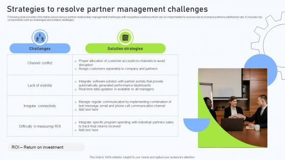 Following slide provides information about various partner relationship management challenges with respective solutions which can be implemented by businesses to increase partners satisfaction rate. It includes key components such as challenges and solution strategies. If your project calls for a presentation, then Slidegeeks is your go-to partner because we have professionally designed, easy-to-edit templates that are perfect for any presentation. After downloading, you can easily edit Strategies To Resolve Partner Management Challenges Inspiration PDF and make the changes accordingly. You can rearrange slides or fill them with different images. Check out all the handy templates