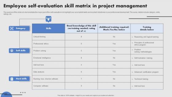 The purpose of this slide is to demonstrates the major goal of the self-evaluation is to highlight your accomplishments and recollect milestones in your professional development. The survey details include category, skills, ratings, etc. Pitch your topic with ease and precision using this Employee Selfevaluation Skill Matrix In Project Management Portrait Pdf. This layout presents information on Soft Skills, Category, Hard Skills. It is also available for immediate download and adjustment. So, changes can be made in the color, design, graphics or any other component to create a unique layout. The purpose of this slide is to demonstrates the major goal of the self-evaluation is to highlight your accomplishments and recollect milestones in your professional development. The survey details include category, skills, ratings, etc.