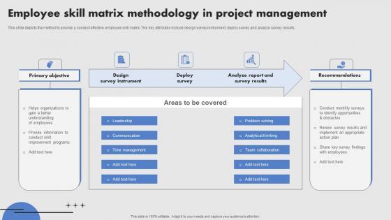 This slide depicts the method to provide a conduct effective employee skill matrix. The key attributes include design survey instrument, deploy survey and analyze survey results. Showcasing this set of slides titled Employee Skill Matrix Methodology In Project Management Formats Pdf. The topics addressed in these templates are Design Survey Instrument, Deploy Survey, Analyze Report. All the content presented in this PPT design is completely editable. Download it and make adjustments in color, background, font etc. as per your unique business setting. This slide depicts the method to provide a conduct effective employee skill matrix. The key attributes include design survey instrument, deploy survey and analyze survey results.