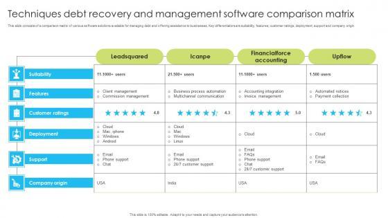 This slide consists of a comparison matrix of various software solutions available for managing debt and offering assistance to businesses. Key differentiators are suitability, features, customer ratings, deployment, support and company origin. Pitch your topic with ease and precision using this Techniques Debt Recovery And Management Software Comparison Matrix Slides Pdf. This layout presents information on Techniques Debt Recovery, Management Software, Comparison Matrix . It is also available for immediate download and adjustment. So, changes can be made in the color, design, graphics or any other component to create a unique layout. This slide consists of a comparison matrix of various software solutions available for managing debt and offering assistance to businesses. Key differentiators are suitability, features, customer ratings, deployment, support and company origin.