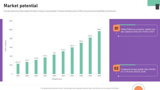 This slide caters to the details related to the fintech companys market potential. It includes information such as CAGR Compound Annual Growth Rate and market size. Are you in need of a template that can accommodate all of your creative concepts This one is crafted professionally and can be altered to fit any style. Use it with Google Slides or PowerPoint. Include striking photographs, symbols, depictions, and other visuals. Fill, move around, or remove text boxes as desired. Test out color palettes and font mixtures. Edit and save your work, or work with colleagues. Download Market Potential Financial Management Software Capital Raising Deck Template Pdf and observe how to make your presentation outstanding. Give an impeccable presentation to your group and make your presentation unforgettable. This slide caters to the details related to the fintech companys market potential. It includes information such as CAGR Compound Annual Growth Rate and market size.
