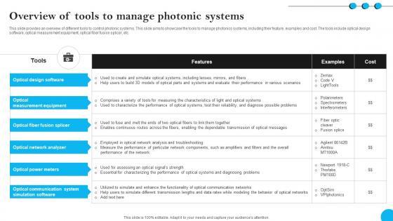 This slide provides an overview of different tools to control photonic systems. This slide aims to showcase the tools to manage photonics systems, including their feature, examples and cost. The tools include optical design software, optical measurement equipment, optical fiber fusion splicer, etc. Boost your pitch with our creative Fibers IT Overview Of Tools To Manage Photonic Systems. Deliver an awe-inspiring pitch that will mesmerize everyone. Using these presentation templates you will surely catch everyones attention. You can browse the ppts collection on our website. We have researchers who are experts at creating the right content for the templates. So you do not have to invest time in any additional work. Just grab the template now and use them. This slide provides an overview of different tools to control photonic systems. This slide aims to showcase the tools to manage photonics systems, including their feature, examples and cost. The tools include optical design software, optical measurement equipment, optical fiber fusion splicer, etc.