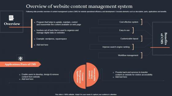 Following slide provides overview of content management system CMS for website operational efficiency and development. It include elements such as description, parts, applications and benefits. Create an editable Overview Of Website Content Management System Step By Step Guide Demonstration PDF that communicates your idea and engages your audience. Whether you are presenting a business or an educational presentation, pre-designed presentation templates help save time. Overview Of Website Content Management System Step By Step Guide Demonstration PDF is highly customizable and very easy to edit, covering many different styles from creative to business presentations. Slidegeeks has creative team members who have crafted amazing templates. So, go and get them without any delay. Following slide provides overview of content management system CMS for website operational efficiency and development. It include elements such as description, parts, applications and benefits.