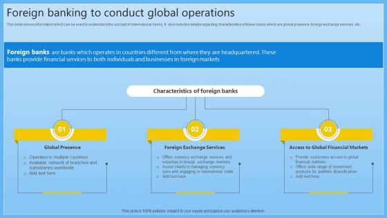 This slide shows information which can be used to understand the concept of international banks. It also includes details regarding characteristics of these banks which are global presence, foreign exchange services, etc. Welcome to our selection of the Foreign Banking To Conduct Global Operations Complete Guide On Managing Banking Fin SS V. These are designed to help you showcase your creativity and bring your sphere to life. Planning and Innovation are essential for any business that is just starting out. This collection contains the designs that you need for your everyday presentations. All of our PowerPoints are 100Percent editable, so you can customize them to suit your needs. This multi-purpose template can be used in various situations. Grab these presentation templates today. This slide shows information which can be used to understand the concept of international banks. It also includes details regarding characteristics of these banks which are global presence, foreign exchange services, etc.