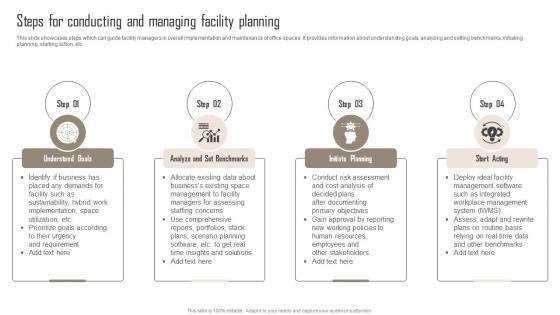 This slide showcases steps which can guide facility managers in overall implementation and maintenance of office spaces. It provides information about understanding goals, analyzing and setting benchmarks, initiating planning, starting action, etc. Find a pre designed and impeccable Steps For Conducting And Comprehensive Guide For Building Management Inspiration Pdf. The templates can ace your presentation without additional effort. You can download these easy to edit presentation templates to make your presentation stand out from others. So, what are you waiting for Download the template from Slidegeeks today and give a unique touch to your presentation. This slide showcases steps which can guide facility managers in overall implementation and maintenance of office spaces. It provides information about understanding goals, analyzing and setting benchmarks, initiating planning, starting action, etc.