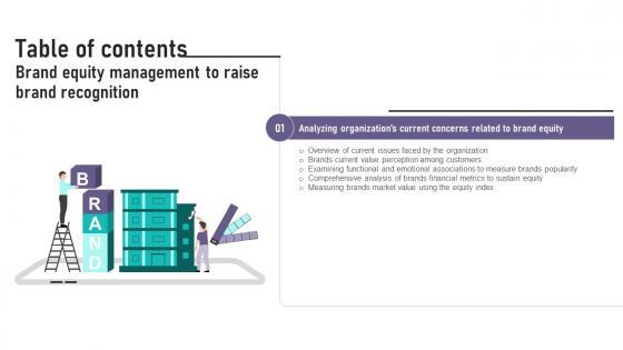 Explore a selection of the finest Table Of Contents Brand Equity Management To Raise Brand Recognition here. With a plethora of professionally designed and pre-made slide templates, you can quickly and easily find the right one for your upcoming presentation. You can use our Table Of Contents Brand Equity Management To Raise Brand Recognition to effectively convey your message to a wider audience. Slidegeeks has done a lot of research before preparing these presentation templates. The content can be personalized and the slides are highly editable. Grab templates today from Slidegeeks. Our Table Of Contents Brand Equity Management To Raise Brand Recognition are topically designed to provide an attractive backdrop to any subject. Use them to look like a presentation pro.