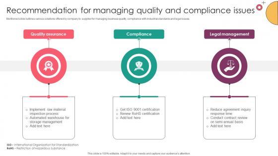 Mentioned slide outlines various solutions offered by company to supplier for managing business quality, compliance with industrial standards and legal issues. Boost your pitch with our creative A137 Vendor Management Audit Recommendation For Managing Quality. Deliver an awe-inspiring pitch that will mesmerize everyone. Using these presentation templates you will surely catch everyones attention. You can browse the ppts collection on our website. We have researchers who are experts at creating the right content for the templates. So you do not have to invest time in any additional work. Just grab the template now and use them. Mentioned slide outlines various solutions offered by company to supplier for managing business quality, compliance with industrial standards and legal issues.