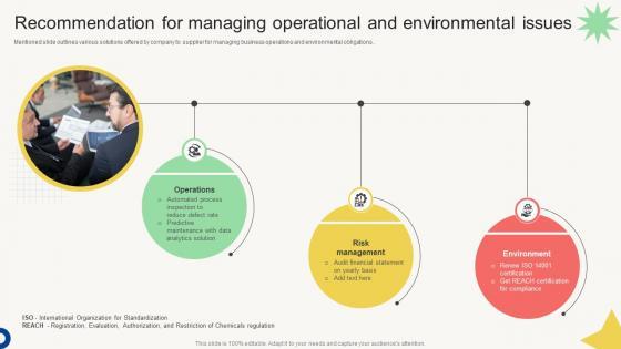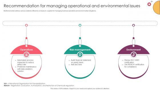 Mentioned slide outlines various solutions offered by company to supplier for managing business operations and environmental obligations.. Explore a selection of the finest Vendor Management Audit Recommendation For Managing Operational here. With a plethora of professionally designed and pre-made slide templates, you can quickly and easily find the right one for your upcoming presentation. You can use our Vendor Management Audit Recommendation For Managing Operational to effectively convey your message to a wider audience. Slidegeeks has done a lot of research before preparing these presentation templates. The content can be personalized and the slides are highly editable. Grab templates today from Slidegeeks. Mentioned slide outlines various solutions offered by company to supplier for managing business operations and environmental obligations..