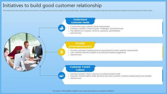 This slide shows various tips which can be used by commercial banks to build positive customer relationships. These tactics are understand customer needs, provide personalized service and customer centric culture. Presenting this PowerPoint presentation, titled Initiatives To Build Good Customer Relationship Complete Guide On Managing Banking Fin SS V, with topics curated by our researchers after extensive research. This editable presentation is available for immediate download and provides attractive features when used. Download now and captivate your audience. Presenting this Initiatives To Build Good Customer Relationship Complete Guide On Managing Banking Fin SS V. Our researchers have carefully researched and created these slides with all aspects taken into consideration. This is a completely customizable Initiatives To Build Good Customer Relationship Complete Guide On Managing Banking Fin SS V that is available for immediate downloading. Download now and make an impact on your audience. Highlight the attractive features available with our PPTs. This slide shows various tips which can be used by commercial banks to build positive customer relationships. These tactics are understand customer needs, provide personalized service and customer centric culture.