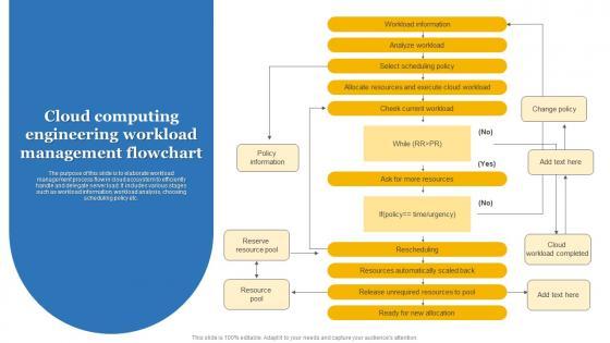 The purpose of this slide is to elaborate workload management process flow in cloud ecosystem to efficiently handle and delegate server load. It includes various stages such as workload information, workload analysis, choosing scheduling policy etc. Showcasing this set of slides titled Cloud Computing Engineering Workload Management Flowchart Template Pdf The topics addressed in these templates are Policy Information, Reserve Resource, Workload Completed All the content presented in this PPT design is completely editable. Download it and make adjustments in color, background, font etc. as per your unique business setting. The purpose of this slide is to elaborate workload management process flow in cloud ecosystem to efficiently handle and delegate server load. It includes various stages such as workload information, workload analysis, choosing scheduling policy etc.