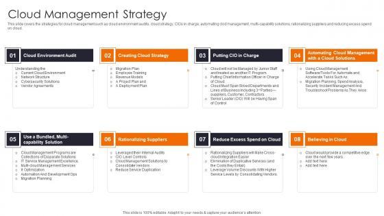 This slide covers the strategies for cloud management such as cloud environment audits, cloud strategy, CIOs in charge, automating clod management, multi capability solutions, rationalizing suppliers and reducing excess spend on cloud. Coming up with a presentation necessitates that the majority of the effort goes into the content and the message you intend to convey. The visuals of a PowerPoint presentation can only be effective if it supplements and supports the story that is being told. Keeping this in mind our experts created Cloud Management Strategy Enhancing Workload Efficiency Through Cloud Architecture Professional Pdf to reduce the time that goes into designing the presentation. This way, you can concentrate on the message while our designers take care of providing you with the right template for the situation. This slide covers the strategies for cloud management such as cloud environment audits, cloud strategy, CIOs in charge, automating clod management, multi capability solutions, rationalizing suppliers and reducing excess spend on cloud.