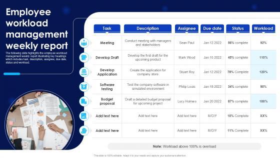 Boost your pitch with our creative Employee Workload Management Weekly Report. Deliver an awe-inspiring pitch that will mesmerize everyone. Using these presentation templates you will surely catch everyones attention. You can browse the ppts collection on our website. We have researchers who are experts at creating the right content for the templates. So you do not have to invest time in any additional work. Just grab the template now and use them. The slide showcases an employee workload management weekly report to track and manage team responsibilities. It highlights key components such as tasks, descriptions, assignees, due dates, statuses, and workload.