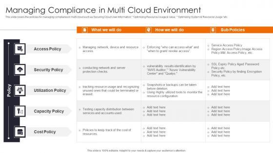 This slide covers the policies for managing compliance in multi cloud such as Securing Cloud User Information, Optimizing Resource Usage and Value, Optimizing System and Resource Usage etc. Here you can discover an assortment of the finest PowerPoint and Google Slides templates. With these templates, you can create presentations for a variety of purposes while simultaneously providing your audience with an eye catching visual experience. Download Managing Compliance In Multi Enhancing Workload Efficiency Through Cloud Architecture Download Pdf to deliver an impeccable presentation. These templates will make your job of preparing presentations much quicker, yet still, maintain a high level of quality. Slidegeeks has experienced researchers who prepare these templates and write high quality content for you. Later on, you can personalize the content by editing the Managing Compliance In Multi Enhancing Workload Efficiency Through Cloud Architecture Download Pdf. This slide covers the policies for managing compliance in multi cloud such as Securing Cloud User Information, Optimizing Resource Usage and Value, Optimizing System and Resource Usage etc.