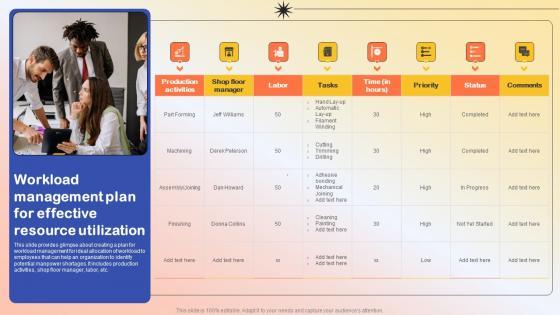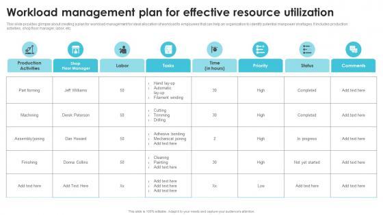 This slide provides glimpse about creating a plan for workload management for ideal allocation of workload to employees that can help an organization to identify potential manpower shortages. It includes production activities, shop floor manager, labor, etc. Are you searching for a Workload Management Plan For Effective Resource Utilization Template PDF that is uncluttered, straightforward, and original Its easy to edit, and you can change the colors to suit your personal or business branding. For a presentation that expresses how much effort you have put in, this template is ideal With all of its features, including tables, diagrams, statistics, and lists, its perfect for a business plan presentation. Make your ideas more appealing with these professional slides. Download Workload Management Plan For Effective Resource Utilization Template PDF from Slidegeeks today.