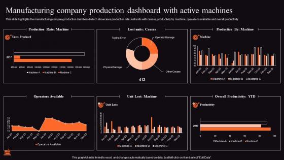 This slide highlights the manufacturing company production dashboard which showcases production rate, lost units with causes, productivity by machine, operations available and overall productivity. Take your projects to the next level with our ultimate collection of Manufacturing Company Production Dashboard With Active Machines Template PDF. Slidegeeks has designed a range of layouts that are perfect for representing task or activity duration, keeping track of all your deadlines at a glance. Tailor these designs to your exact needs and give them a truly corporate look with your own brand colors they will make your projects stand out from the rest.