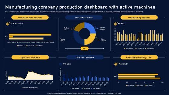 This slide highlights the manufacturing company production dashboard which showcases production rate, lost units with causes, productivity by machine, operations available and overall productivity. Explore a selection of the finest Customer Goods Production Manufacturing Company Production Dashboard With Active Slides PDF here. With a plethora of professionally designed and pre-made slide templates, you can quickly and easily find the right one for your upcoming presentation. You can use our Customer Goods Production Manufacturing Company Production Dashboard With Active Slides PDF to effectively convey your message to a wider audience. Slidegeeks has done a lot of research before preparing these presentation templates. The content can be personalized and the slides are highly editable. Grab templates today from Slidegeeks.