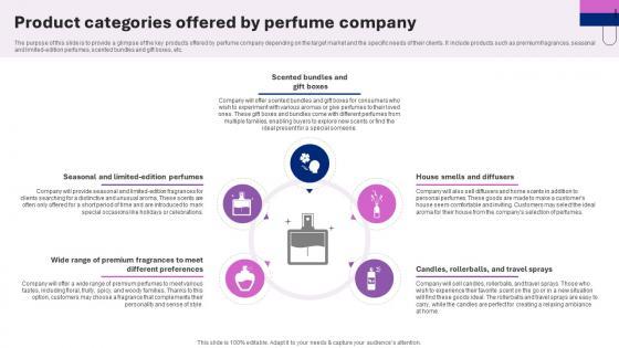 The purpose of this slide is to provide a glimpse of the key products offered by perfume company depending on the target market and the specific needs of their clients. It include products such as premium fragrances, seasonal and limited-edition perfumes, scented bundles and gift boxes, etc. Are you searching for a Perfume Manufacturing Business Plan Product Categories Offered By Perfume Company BP SS V that is uncluttered, straightforward, and original Its easy to edit, and you can change the colors to suit your personal or business branding. For a presentation that expresses how much effort you have put in, this template is ideal With all of its features, including tables, diagrams, statistics, and lists, its perfect for a business plan presentation. Make your ideas more appealing with these professional slides. Download Perfume Manufacturing Business Plan Product Categories Offered By Perfume Company BP SS V from Slidegeeks today. The purpose of this slide is to provide a glimpse of the key products offered by perfume company depending on the target market and the specific needs of their clients. It include products such as premium fragrances, seasonal and limited-edition perfumes, scented bundles and gift boxes, etc.