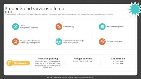 This slide caters to details related to a company that provides solutions to manufacturers unique problems, creating secure, well-designed solutions, and generating data-driven insights. Coming up with a presentation necessitates that the majority of the effort goes into the content and the message you intend to convey. The visuals of a PowerPoint presentation can only be effective if it supplements and supports the story that is being told. Keeping this in mind our experts created Products And Services Offered Manufacturing Control Software Company Investor PPT Template to reduce the time that goes into designing the presentation. This way, you can concentrate on the message while our designers take care of providing you with the right template for the situation. This slide caters to details related to a company that provides solutions to manufacturers unique problems, creating secure, well-designed solutions, and generating data-driven insights.