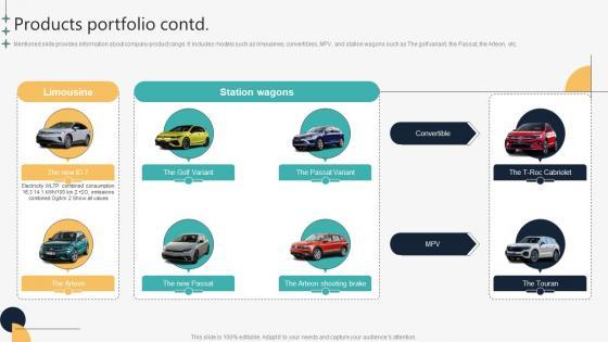 Mentioned slide provides information about company product range. It includes models such as SUVs, Small cars the up and the polo , and compact cars the new ID3 and the golf .Here you can discover an assortment of the finest PowerPoint and Google Slides templates. With these templates, you can create presentations for a variety of purposes while simultaneously providing your audience with an eye-catching visual experience. Download Products Portfolio Automotive Manufacturing Company Profile CP SS V to deliver an impeccable presentation. These templates will make your job of preparing presentations much quicker, yet still, maintain a high level of quality. Slidegeeks has experienced researchers who prepare these templates and write high-quality content for you. Later on, you can personalize the content by editing the Products Portfolio Automotive Manufacturing Company Profile CP SS V. Mentioned slide provides information about company product range. It includes models such as SUVs, Small cars andthe up and the poloand, and compact cars andthe new ID3 and the golfand.