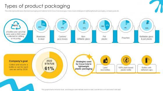 This slide represents types of product packaging and material mix for Coca-Cola beverages. It also covers strategies to lightweight plastic packaging, company goals etc. Do you have an important presentation coming up Are you looking for something that will make your presentation stand out from the rest Look no further than Types Of Product Packaging Beverage Manufacturer Company Profile Ppt Powerpoint CP SS V. With our professional designs, you can trust that your presentation will pop and make delivering it a smooth process. And with Slidegeeks, you can trust that your presentation will be unique and memorable. So why wait Grab Types Of Product Packaging Beverage Manufacturer Company Profile Ppt Powerpoint CP SS V today and make your presentation stand out from the rest This slide represents types of product packaging and material mix for Coca-Cola beverages. It also covers strategies to lightweight plastic packaging, company goals etc.