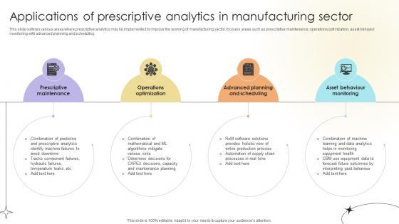 This slide outlines various areas where prescriptive analytics may be implemented to improve the working of manufacturing sector. It covers areas such as prescriptive maintenance, operations optimization, asset behavior monitoring with advanced planning and scheduling.Do you have an important presentation coming up Are you looking for something that will make your presentation stand out from the rest Look no further than Applications Of Prescriptive Analytics In Manufacturing Sector Data Analytics SS V. With our professional designs, you can trust that your presentation will pop and make delivering it a smooth process. And with Slidegeeks, you can trust that your presentation will be unique and memorable. So why wait Grab Applications Of Prescriptive Analytics In Manufacturing Sector Data Analytics SS V today and make your presentation stand out from the rest This slide outlines various areas where prescriptive analytics may be implemented to improve the working of manufacturing sector. It covers areas such as prescriptive maintenance, operations optimization, asset behavior monitoring with advanced planning and scheduling.