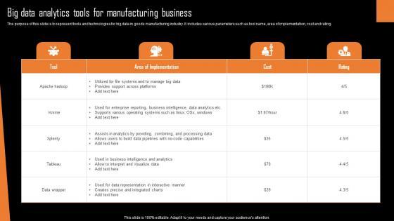 This slide represents the big data analytics tools used in the manufacturing industry, including Apache Hadoop, KNIME, Xplenty, and Cloudera. Most of them are open source and help to generate industry reporting, analysis, finding, sharing, and collecting data. Do you have to make sure that everyone on your team knows about any specific topic I yes, then you should give Intelligent Manufacturing Big Data Analytics Tools For Manufacturing Slides PDF a try. Our experts have put a lot of knowledge and effort into creating this impeccable Intelligent Manufacturing Big Data Analytics Tools For Manufacturing Slides PDF. You can use this template for your upcoming presentations, as the slides are perfect to represent even the tiniest detail. You can download these templates from the Slidegeeks website and these are easy to edit. So grab these today.
