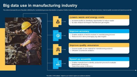 This slide showcases the use of big data in effecting the manufacturing process of production companies. It further includes lowers waste and energy costs, improve accuracy, improve quality assurance and speed up assembly. Showcasing this set of slides titled Big Data Use In Manufacturing Industry Ppt Pictures Summary pdf. The topics addressed in these templates are Waste And Energy Costs, Improve Accuracy, Improve Quality Assurance. All the content presented in this PPT design is completely editable. Download it and make adjustments in color, background, font etc. as per your unique business setting. This slide showcases the use of big data in effecting the manufacturing process of production companies. It further includes lowers waste and energy costs, improve accuracy, improve quality assurance and speed up assembly.