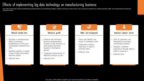 This slides showcases impact of establishing big data practices in manufacturing industry. It effects business in various ways such as reduced machine time, enterprise growth, better cost management and improved customer service.Pitch your topic with ease and precision using this Effects Of Implementing Big Data Technology On Manufacturing Business Mockup Pdf This layout presents information on Reduced Machine Time, Enterprise Growth, Better Cost Management It is also available for immediate download and adjustment. So, changes can be made in the color, design, graphics or any other component to create a unique layout. This slides showcases impact of establishing big data practices in manufacturing industry. It effects business in various ways such as reduced machine time, enterprise growth, better cost management and improved customer service.