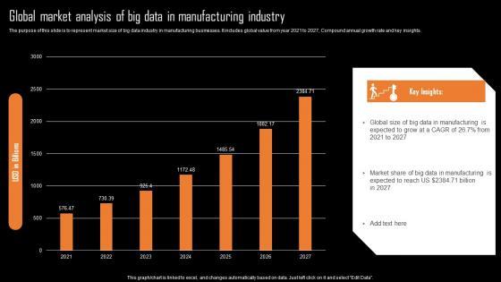 The purpose of this slide is to represent market size of big data industry in manufacturing businesses. It includes global value from year 2021 to 2027, Compound annual growth rate and key insights.Showcasing this set of slides titled Global Market Analysis Of Big Data In Manufacturing Industry Information Pdf The topics addressed in these templates are Data Manufacturing, Expected Grow, Data Manufacturing All the content presented in this PPT design is completely editable. Download it and make adjustments in color, background, font etc. as per your unique business setting. The purpose of this slide is to represent market size of big data industry in manufacturing businesses. It includes global value from year 2021 to 2027, Compound annual growth rate and key insights.