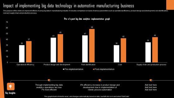 The purpose of this slide is to represent effects of using big data in manufacturing industry. It includes comparison on basis of various parameters such as operational efficiency, product design and development, risk identification, cost and supply chain and production process.Showcasing this set of slides titled Impact Of Implementing Big Data Technology In Automotive Manufacturing Business Guidelines Pdf The topics addressed in these templates are Through Implementing, Process Automation, Development Due Implementation All the content presented in this PPT design is completely editable. Download it and make adjustments in color, background, font etc. as per your unique business setting. The purpose of this slide is to represent effects of using big data in manufacturing industry. It includes comparison on basis of various parameters such as operational efficiency, product design and development, risk identification, cost and supply chain and production process.