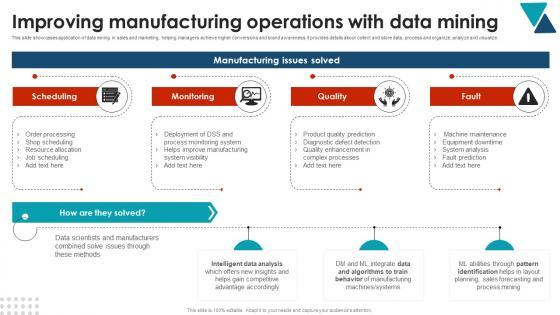 This slide showcases application of data mining in sales and marketing, helping managers achieve higher conversions and brand awareness. It provides details about collect and store data, process and organize, analyze and visualize. Welcome to our selection of the Improving Manufacturing Operations With Using Data Mining Tools To Optimize Processes AI SS V. These are designed to help you showcase your creativity and bring your sphere to life. Planning and Innovation are essential for any business that is just starting out. This collection contains the designs that you need for your everyday presentations. All of our PowerPoints are 100Percent editable, so you can customize them to suit your needs. This multi-purpose template can be used in various situations. Grab these presentation templates today. This slide showcases application of data mining in sales and marketing, helping managers achieve higher conversions and brand awareness. It provides details about collect and store data, process and organize, analyze and visualize.