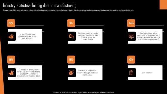 The purpose of this slide is to represent insights of big data implementation in manufacturing industry. It includes various statistics regarding big data analytics, uptime, costs, production etc.Pitch your topic with ease and precision using this Industry Statistics For Big Data In Manufacturing Formats Pdf This layout presents information on Manufacturing Business, Prioritizing Implement Data, Chief Operations It is also available for immediate download and adjustment. So, changes can be made in the color, design, graphics or any other component to create a unique layout. The purpose of this slide is to represent insights of big data implementation in manufacturing industry. It includes various statistics regarding big data analytics, uptime, costs, production etc