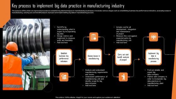 The purpose of this slide is to represent procedure to establish big data techniques in manufacturing businesses. It includes various stages such as establishing business key performance indicators, assessing issues in manufacturing, carrying out cost benefit analysis of project and implementing big data in manufacturing process.Showcasing this set of slides titled Key Process To Implement Big Data Practice In Manufacturing Industry Diagrams Pdf The topics addressed in these templates are Expect Incorporating, Understand Performance, Manufacturing Plant All the content presented in this PPT design is completely editable. Download it and make adjustments in color, background, font etc. as per your unique business setting. The purpose of this slide is to represent procedure to establish big data techniques in manufacturing businesses. It includes various stages such as establishing business key performance indicators, assessing issues in manufacturing, carrying out cost benefit analysis of project and implementing big data in manufacturing process.