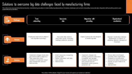 This slide show cases problems that are faced by manufacturing executives in implementing big data practices. It includes challenges such as team onboarding, inaccurate data, integration with prevailing systems and organizational coordination.Showcasing this set of slides titled Solutions To Overcome Big Data Challenges Faced By Manufacturing Firms Ideas Pdf The topics addressed in these templates are Team Onboarding, Inaccurate Data, Integration Prevailing All the content presented in this PPT design is completely editable. Download it and make adjustments in color, background, font etc. as per your unique business setting. This slide show cases problems that are faced by manufacturing executives in implementing big data practices. It includes challenges such as team onboarding, inaccurate data, integration with prevailing systems and organizational coordination.