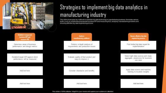 This slide showcases key methods to establish big data technology in manufacturing business. It includes various tactics such as establishing transparent business KPI and measuring ROI, analyzing manufacturing problems and ensuring effective big data engineering process.Pitch your topic with ease and precision using this Strategies To Implement Big Data Analytics In Manufacturing Industry Portrait Pdf This layout presents information on Determine Areas, Performance Design Metrics, Performance Measured It is also available for immediate download and adjustment. So, changes can be made in the color, design, graphics or any other component to create a unique layout. This slide showcases key methods to establish big data technology in manufacturing business. It includes various tactics such as establishing transparent business KPI and measuring ROI, analyzing manufacturing problems and ensuring effective big data engineering process.