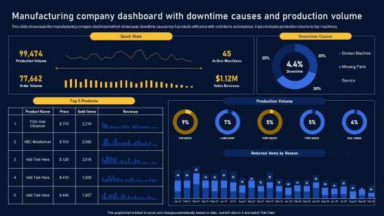 This slide showcases the manufacturing company dashboard which showcases downtime causes top 5 products with price with sold items and revenue, it also includes production volume by top machines. This modern and well arranged Manufacturing Company Dashboard Multinational Organization Customer Goods Diagrams Pdf provides lots of creative possibilities. It is very simple to customize and edit with the Powerpoint Software. Just drag and drop your pictures into the shapes. All facets of this template can be edited with Powerpoint, no extra software is necessary. Add your own material, put your images in the places assigned for them, adjust the colors, and then you can show your slides to the world, with an animated slide included. This slide showcases the manufacturing company dashboard which showcases downtime causes top 5 products with price with sold items and revenue, it also includes production volume by top machines.