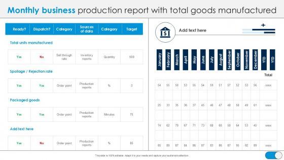 Are you in need of a template that can accommodate all of your creative concepts This one is crafted professionally and can be altered to fit any style. Use it with Google Slides or PowerPoint. Include striking photographs, symbols, depictions, and other visuals. Fill, move around, or remove text boxes as desired. Test out color palettes and font mixtures. Edit and save your work, or work with colleagues. Download Monthly Business Production Report With Total Goods Manufactured PPT PowerPoint SS and observe how to make your presentation outstanding. Give an impeccable presentation to your group and make your presentation unforgettable. Our Monthly Business Production Report With Total Goods Manufactured PPT PowerPoint SS are topically designed to provide an attractive backdrop to any subject. Use them to look like a presentation pro.