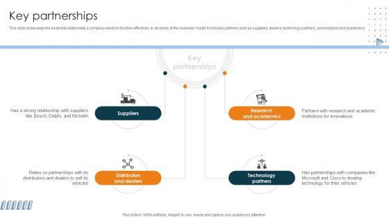 This slide showcases the essential relationship a company needs to function effectively in all areas of the business model. It includes partners such as suppliers, dealers, technology partners, and research and academics. Present like a pro with Key Partnerships Car Manufacturing Company Business Model BMC SS V. Create beautiful presentations together with your team, using our easy-to-use presentation slides. Share your ideas in real-time and make changes on the fly by downloading our templates. So whether you are in the office, on the go, or in a remote location, you can stay in sync with your team and present your ideas with confidence. With Slidegeeks presentation got a whole lot easier. Grab these presentations today. This slide showcases the essential relationship a company needs to function effectively in all areas of the business model. It includes partners such as suppliers, dealers, technology partners, and research and academics.
