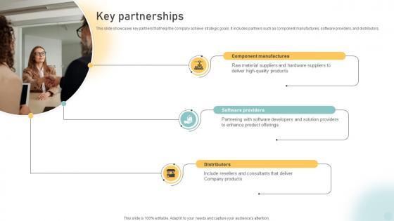 This slide showcases key partners that help the company achieve strategic goals. It includes partners such as component manufactures, software providers, and distributors. Present like a pro with Key Partnerships Pc Manufacturing Company Business Model BMC SS V. Create beautiful presentations together with your team, using our easy-to-use presentation slides. Share your ideas in real-time and make changes on the fly by downloading our templates. So whether you are in the office, on the go, or in a remote location, you can stay in sync with your team and present your ideas with confidence. With Slidegeeks presentation got a whole lot easier. Grab these presentations today. This slide showcases key partners that help the company achieve strategic goals. It includes partners such as component manufactures, software providers, and distributors.