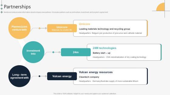 Mentioned slide provides information about company new partners. It includes partners such as joint venture, investment, and long term agreement.Presenting this PowerPoint presentation, titled Partnerships Automotive Manufacturing Company Profile CP SS V, with topics curated by our researchers after extensive research. This editable presentation is available for immediate download and provides attractive features when used. Download now and captivate your audience. Presenting this Partnerships Automotive Manufacturing Company Profile CP SS V. Our researchers have carefully researched and created these slides with all aspects taken into consideration. This is a completely customizable Partnerships Automotive Manufacturing Company Profile CP SS V that is available for immediate downloading. Download now and make an impact on your audience. Highlight the attractive features available with our PPTs. Mentioned slide provides information about company new partners. It includes partners such as joint venture, investment, and long term agreement.
