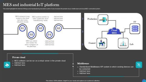 This slide highlights the internet of things and manufacturing execution system. It also includes the private cloud, middle ware and cloud MES connected system. Slidegeeks has constructed IOT Use Cases For Manufacturing Mes And Industrial IOT Platform Pictures PDF after conducting extensive research and examination. These presentation templates are constantly being generated and modified based on user preferences and critiques from editors. Here, you will find the most attractive templates for a range of purposes while taking into account ratings and remarks from users regarding the content. This is an excellent jumping off point to explore our content and will give new users an insight into our top notch PowerPoint Templates.