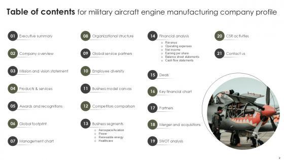 Use this Military Aircraft Engine Manufacturing Company Profile Ppt Powerpoint CP CD V to ensure the business world gets to know you as a presentation expert with tremendous recall value. With its focus on providing the worlds best designs to highlight business ideas that have the potential to change the world, this PPT Template is sure to win you clients. The complete deck in fifty four slides is a compendium of information, structured in a manner that provides the best framework for a presentation. Use this completely editable and customizable presentation to make an impact and improve your order book. Download now. Our Military Aircraft Engine Manufacturing Company Profile Ppt Powerpoint CP CD V are topically designed to provide an attractive backdrop to any subject. Use them to look like a presentation pro.