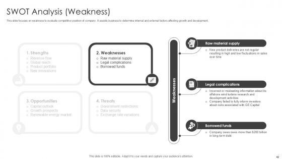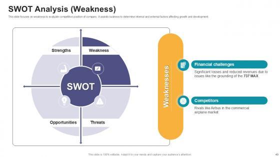 This slide focuses on weakness to evaluate competitive position of company. It assists business to determine internal and external factors affecting growth and development. This SWOT Analysis Weakness Vehicle Manufacturer Company Profile PPT Presentation CP SS V from Slidegeeks makes it easy to present information on your topic with precision. It provides customization options, so you can make changes to the colors, design, graphics, or any other component to create a unique layout. It is also available for immediate download, so you can begin using it right away. Slidegeeks has done good research to ensure that you have everything you need to make your presentation stand out. Make a name out there for a brilliant performance. This slide focuses on weakness to evaluate competitive position of company. It assists business to determine internal and external factors affecting growth and development.
