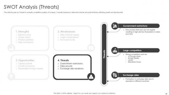 This slide focuses on Threats to evaluate competitive position of company. It assists business to determine internal and external factors affecting growth and development. Here you can discover an assortment of the finest PowerPoint and Google Slides templates. With these templates, you can create presentations for a variety of purposes while simultaneously providing your audience with an eye-catching visual experience. Download SWOT Analysis Threats Vehicle Manufacturer Company Profile PPT Example CP SS V to deliver an impeccable presentation. These templates will make your job of preparing presentations much quicker, yet still, maintain a high level of quality. Slidegeeks has experienced researchers who prepare these templates and write high-quality content for you. Later on, you can personalize the content by editing the SWOT Analysis Threats Vehicle Manufacturer Company Profile PPT Example CP SS V. This slide focuses on Threats to evaluate competitive position of company. It assists business to determine internal and external factors affecting growth and development.